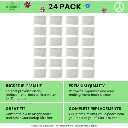 CONTENT: This set of 24 carbon filters fulfills the need of one year’s supply for most households. *Item not made by Megahome . Made by Green Piece Mfg in the USA